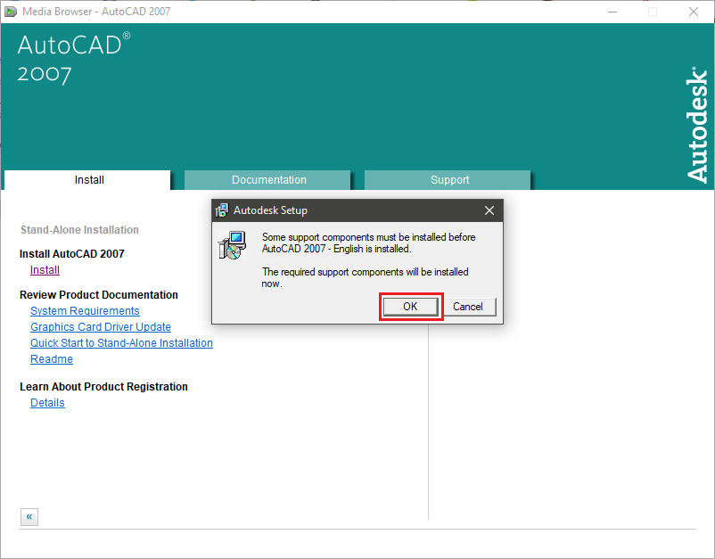 bạn nhớ chọn ok để cài đặt các thành phần cần thiết trước khi cài autocad.