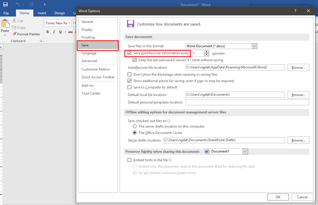 Sau đó hãy chỉnh thời gian ở ô trước chữ “minutes” để Microsoft Word tự lưu lại tài liệu cho bạn. Ở đây mình để là số “1” tức là sau mỗi 1 phút Word sẽ tự lưu lại tài liệu của bạn vào đường dẫn phía dưới. Bạn cũng có thể thay đổi đường dẫn file tự đông lưu nếu muốn bằng cách click Browse và chọn thư mục lưu.