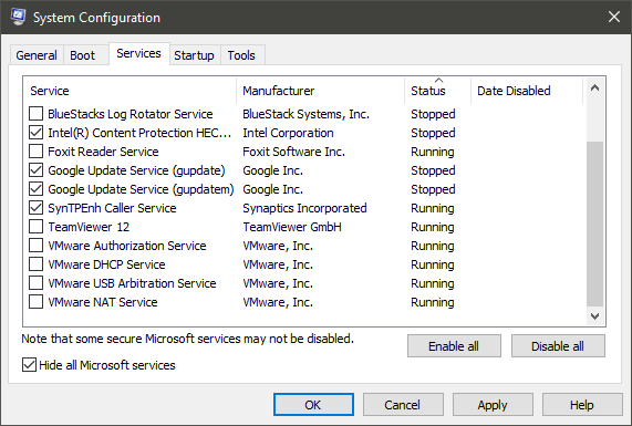 Như 2 hình trên, mình đã ẩn các dịch vụ của Microsoft và tắt các dịch vụ không cần thiết, chỉ để lại các dịch vụ vể màn hinh đồ hoạ, âm thanh, phần mểm diệt virus và một số dịch vụ của google mà mình đang sử dụng. Sau đó nhớ ấn Apply để áp dụng thay đổi.
